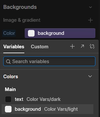 2. W stylach about ustaw Backgrounds, dodając zmienną poprzez kliknięcie fioletowego kółka i z grupy Main wybierz background.